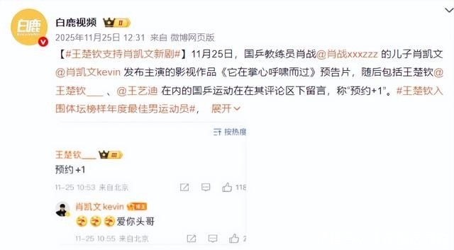 白鹿视频|王楚钦支持肖凯文新剧 20251125