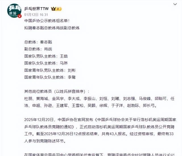 乒乓世界WTT|中国乒协公示教练组名单 20260112