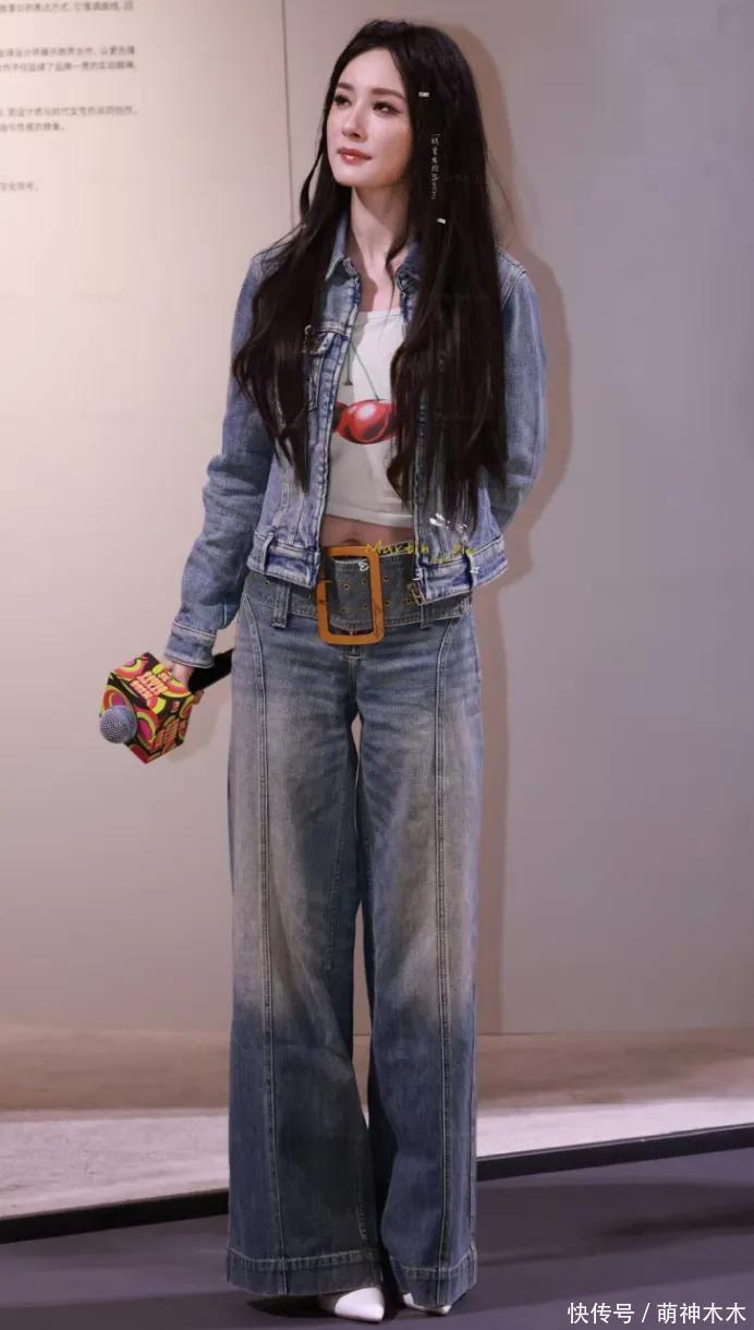 而全身造型,杨幂的搭配也有些过时,上装是牛仔外套搭露脐白T,下装是高腰阔腿裤搭尖头高跟鞋,按道理来说这一套不会出大错。但或许可能真的是造型与年龄不适配,从头到脚都很奇怪,头发搭在肩上显得很厚重累赘,阔腿裤的宽腰带特别浮夸,没有显出复古的气质,就是很土,还有一种硬凑的违和感。
