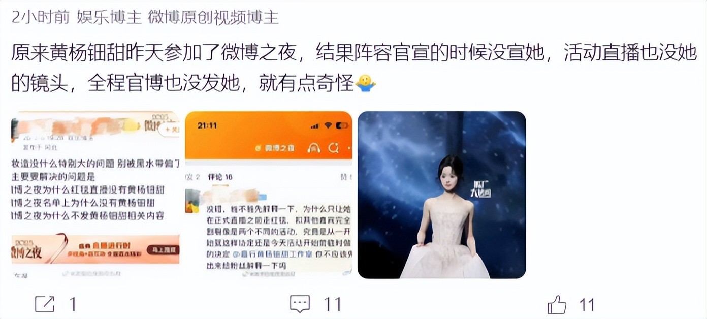 在很长一段时间内,黄杨钿甜都没有出来活动,最初,很多网友并没有意识到黄杨钿甜来微博之夜,因为官方也没有官宣,直播也没看到她的身影,可是网上却传出黄杨钿甜走红毯的照片。